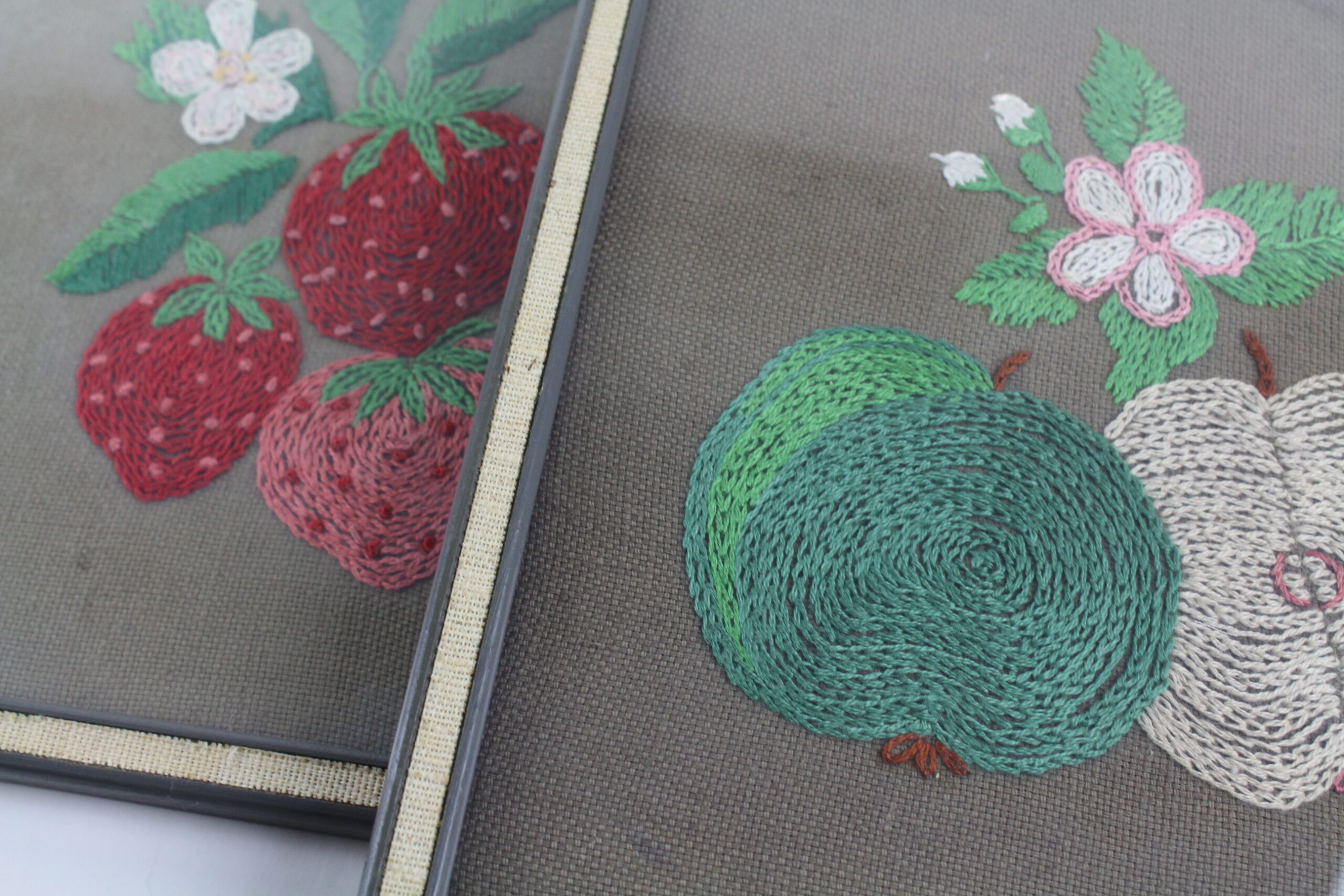 Mycket söta handbroderade tavlor med frukter och bär. Säljes tillsammans, 4 stycken.