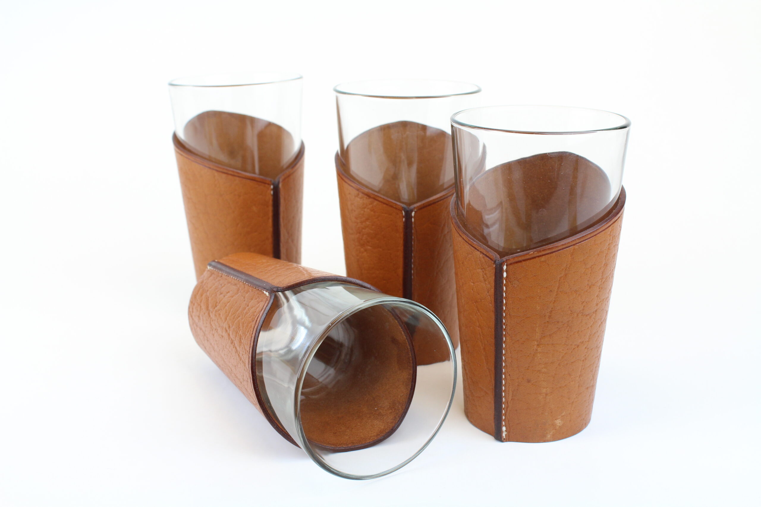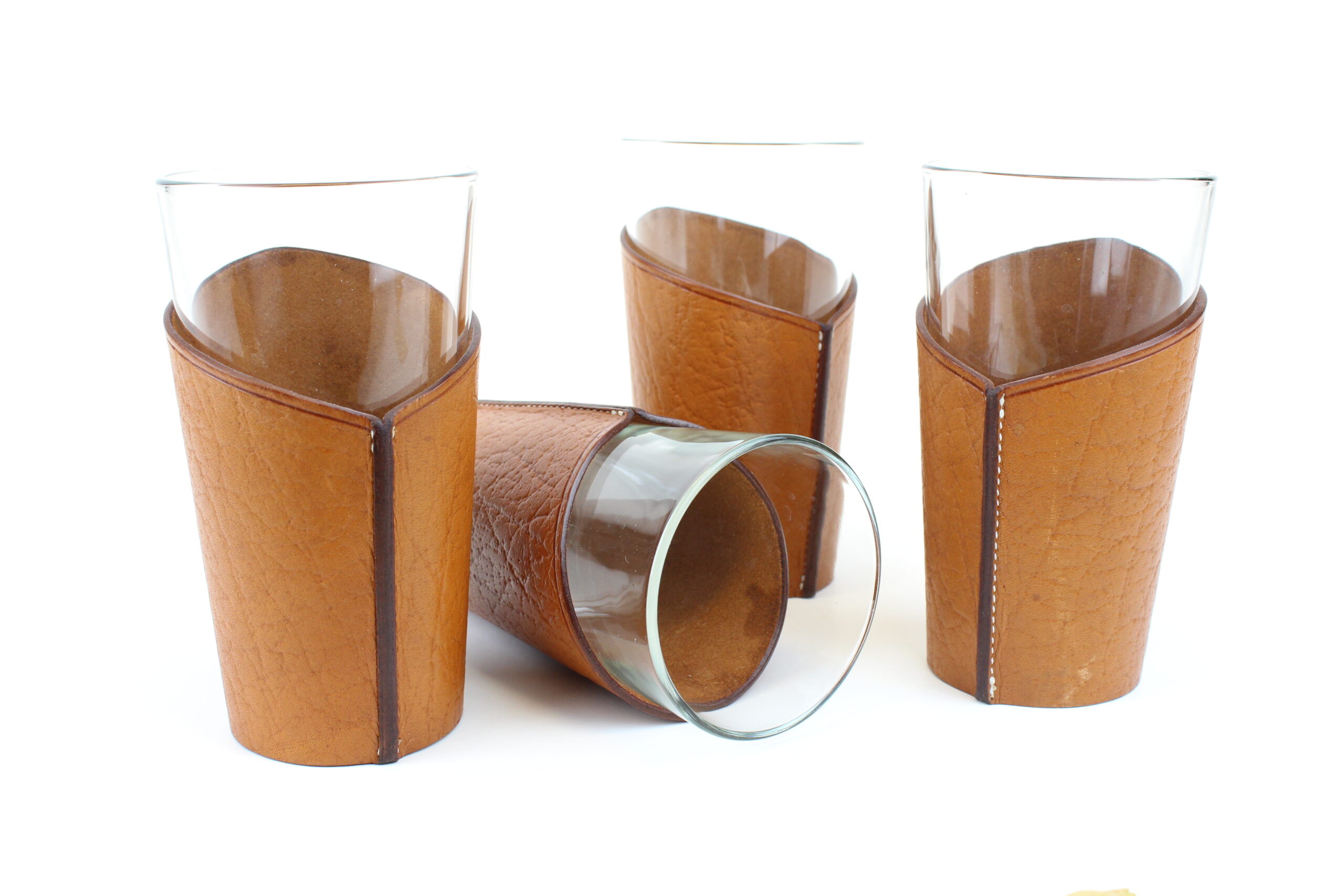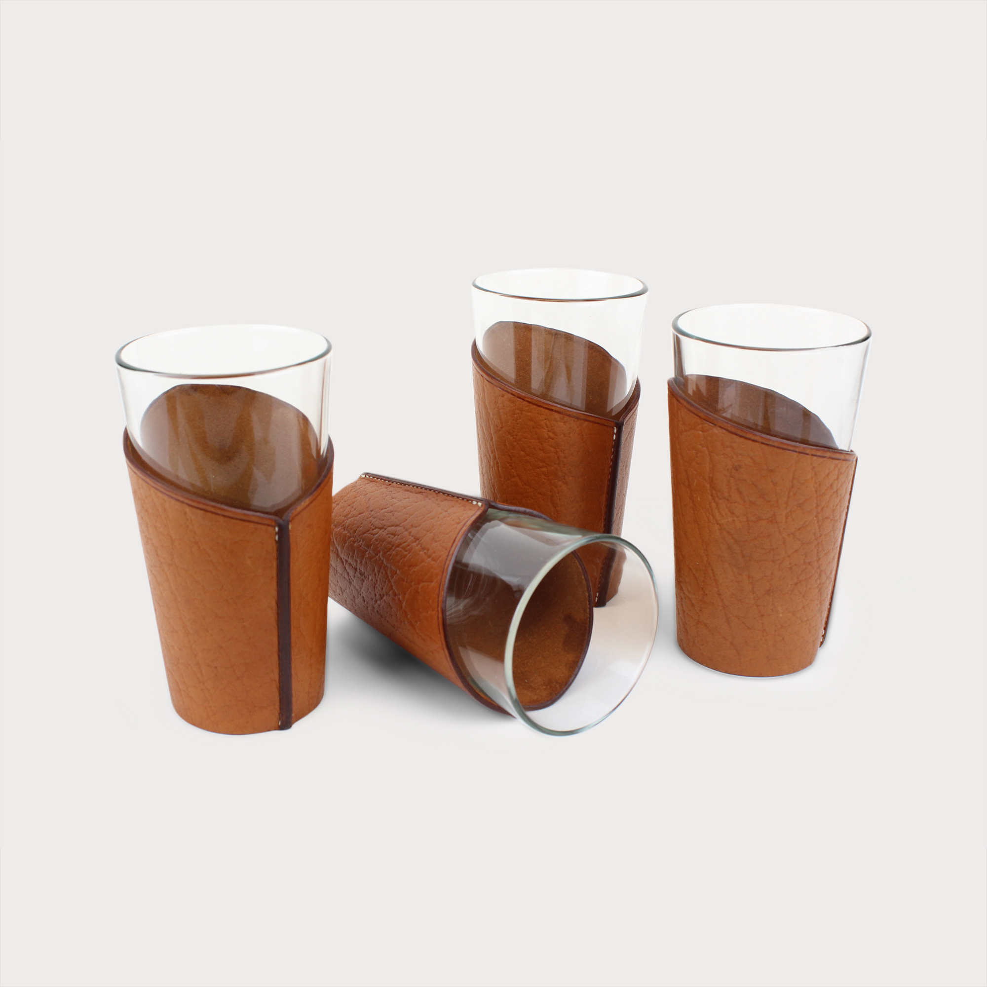 Coffee Latte glasses with leather holder, sold as a set of 4.