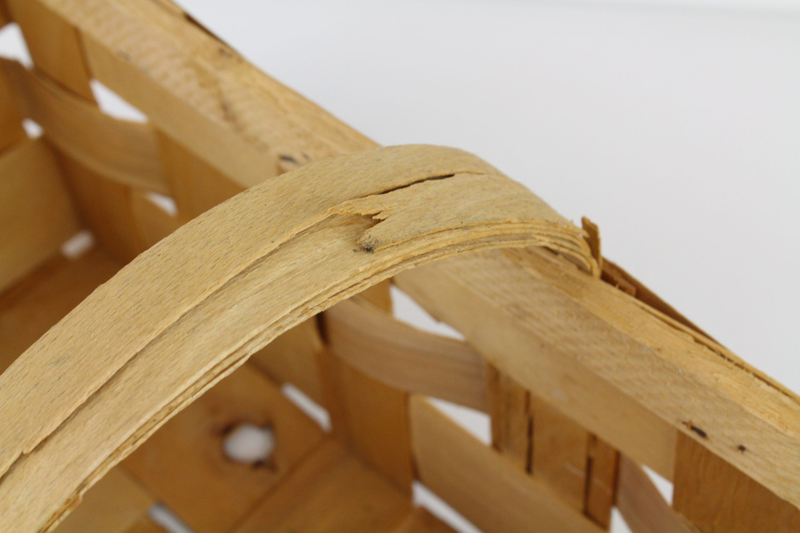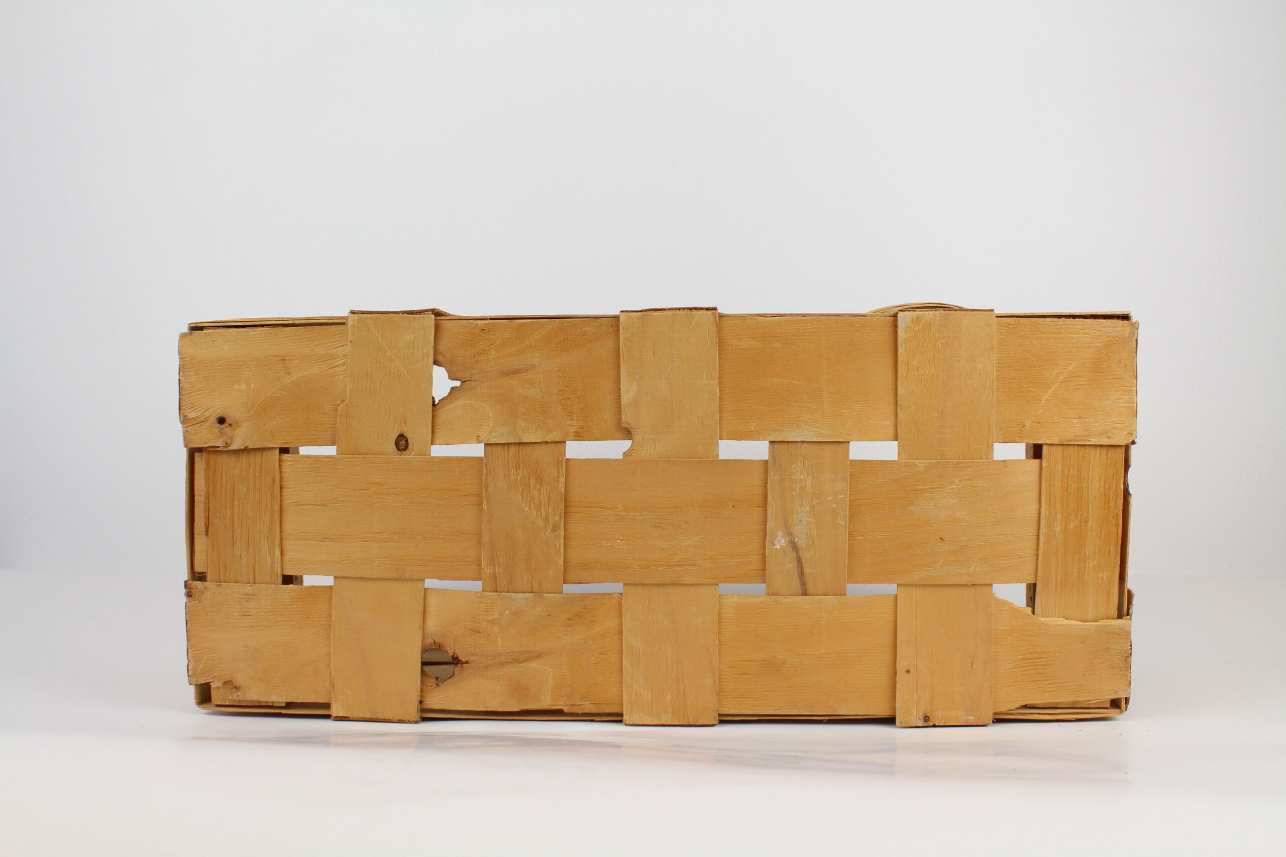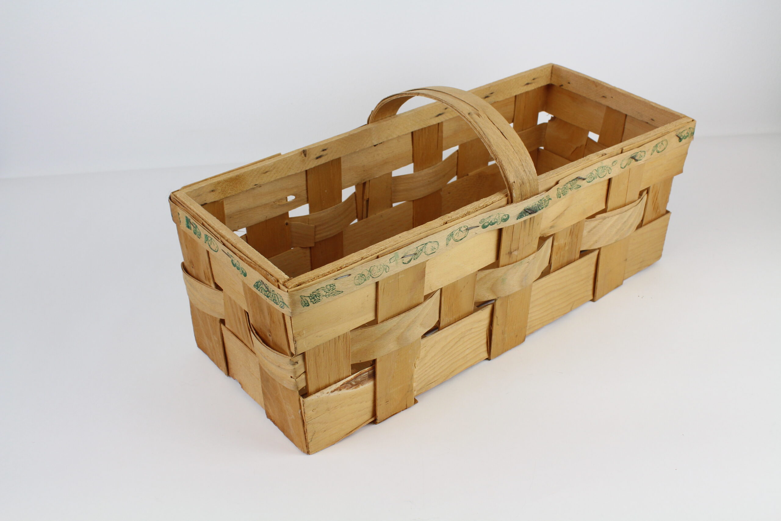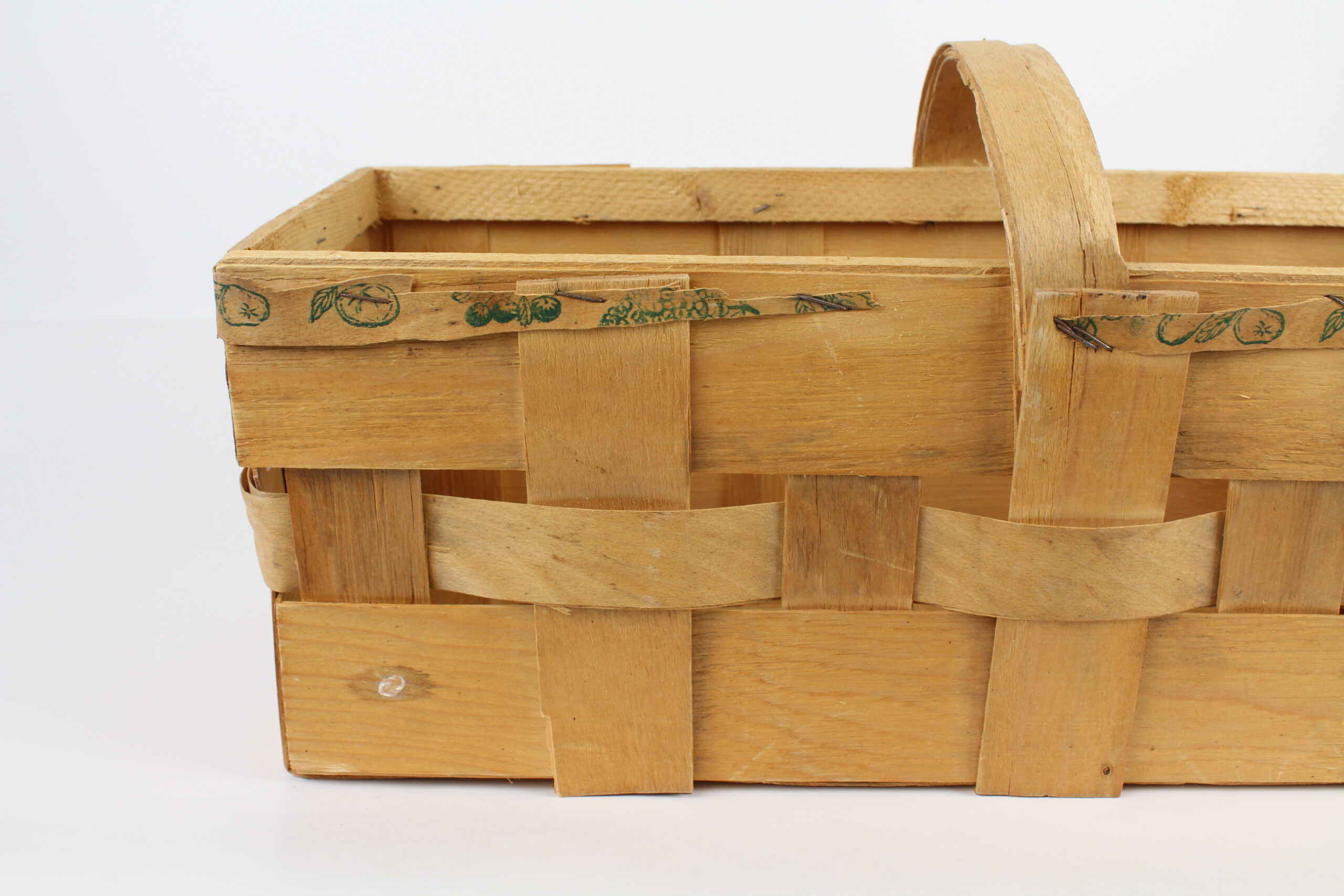 Flätad svampkorg dekorerat med ett tryck av bär i grönt. Se bilder för skick.