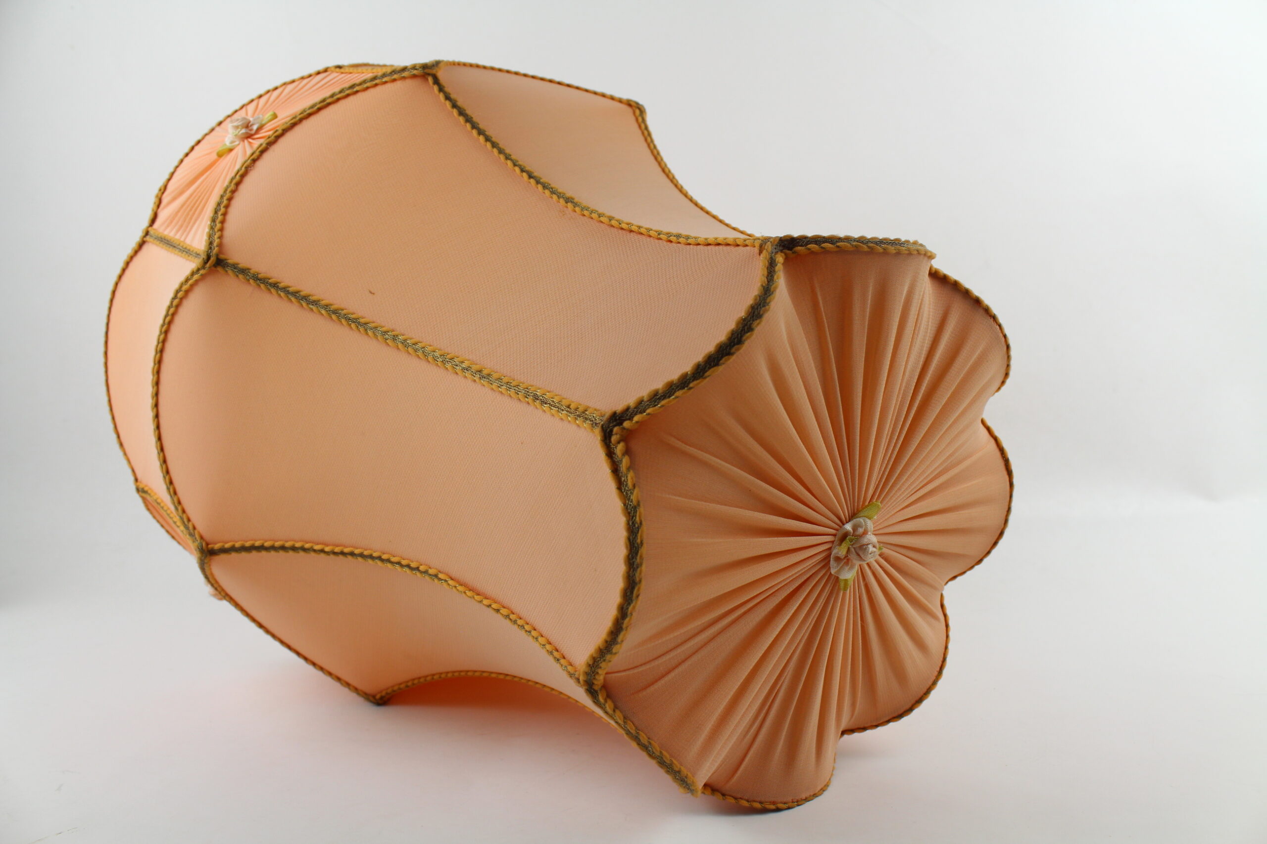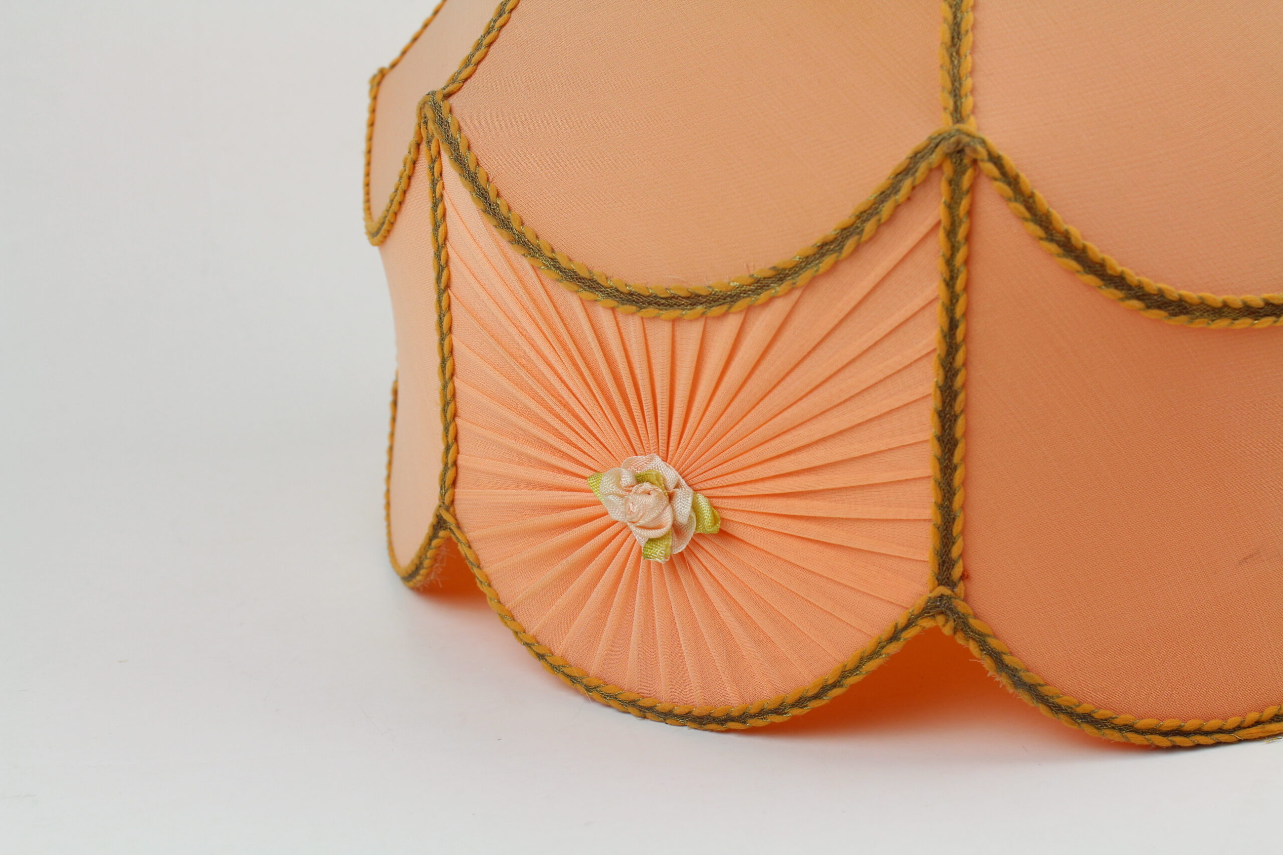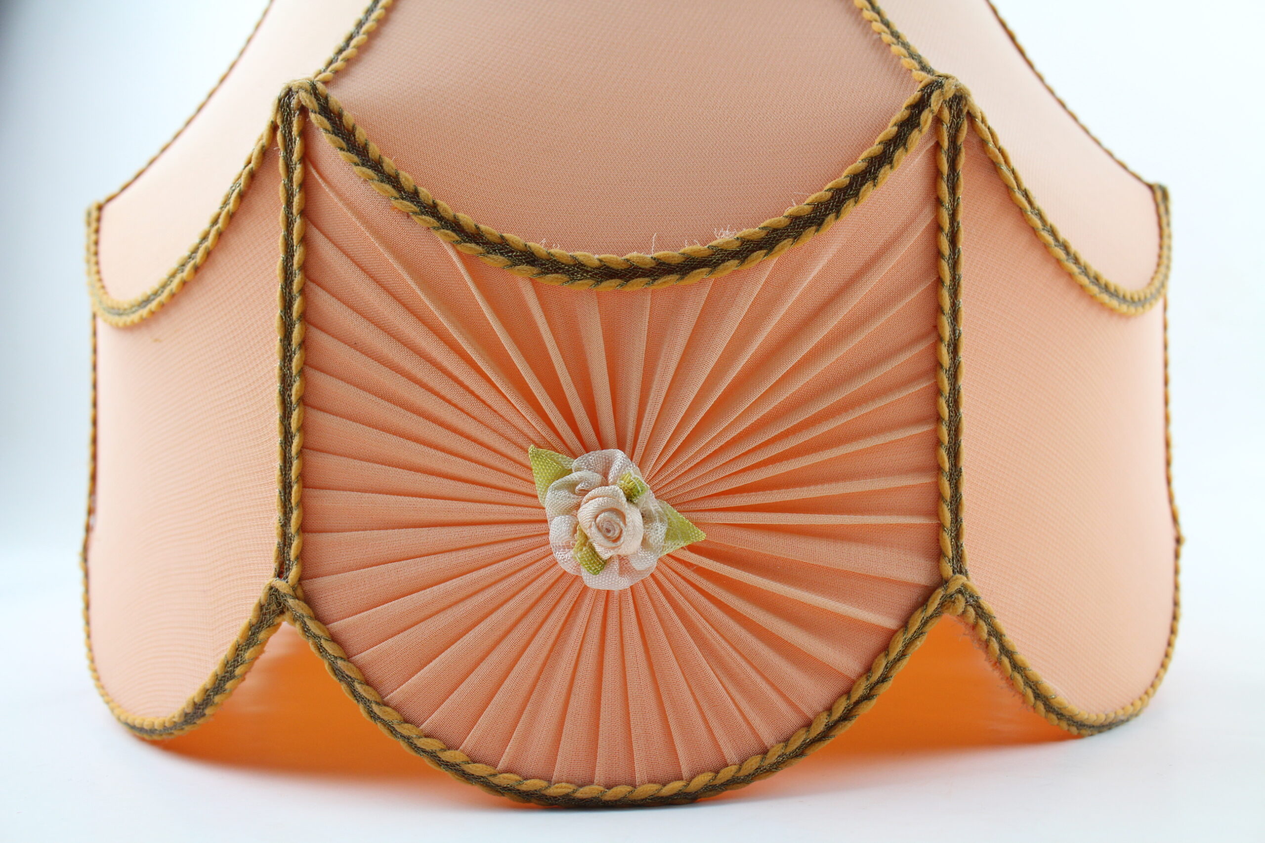 Ljusrosa lampskärm med dekorativa små tygrosor.