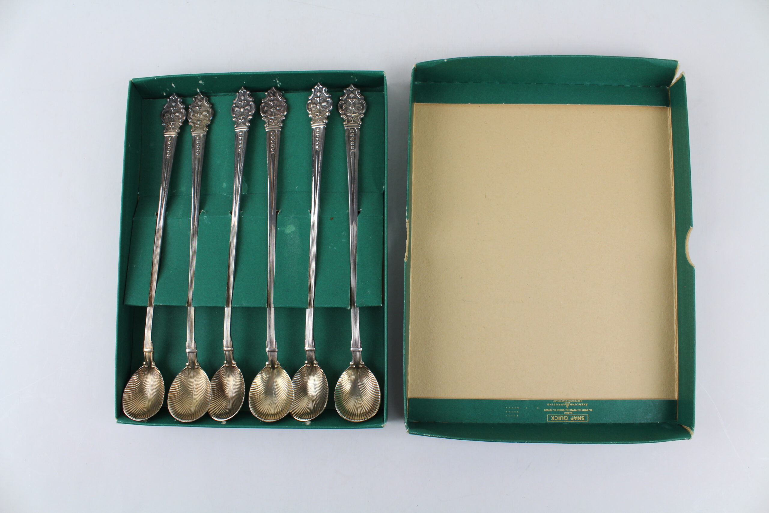 Orginalkartong med 6 stycken charmiga långa saftskedar i Nysilver. Tillverkade i Sverige. Märkta EX. PR N.S. ALP Mått kartong: