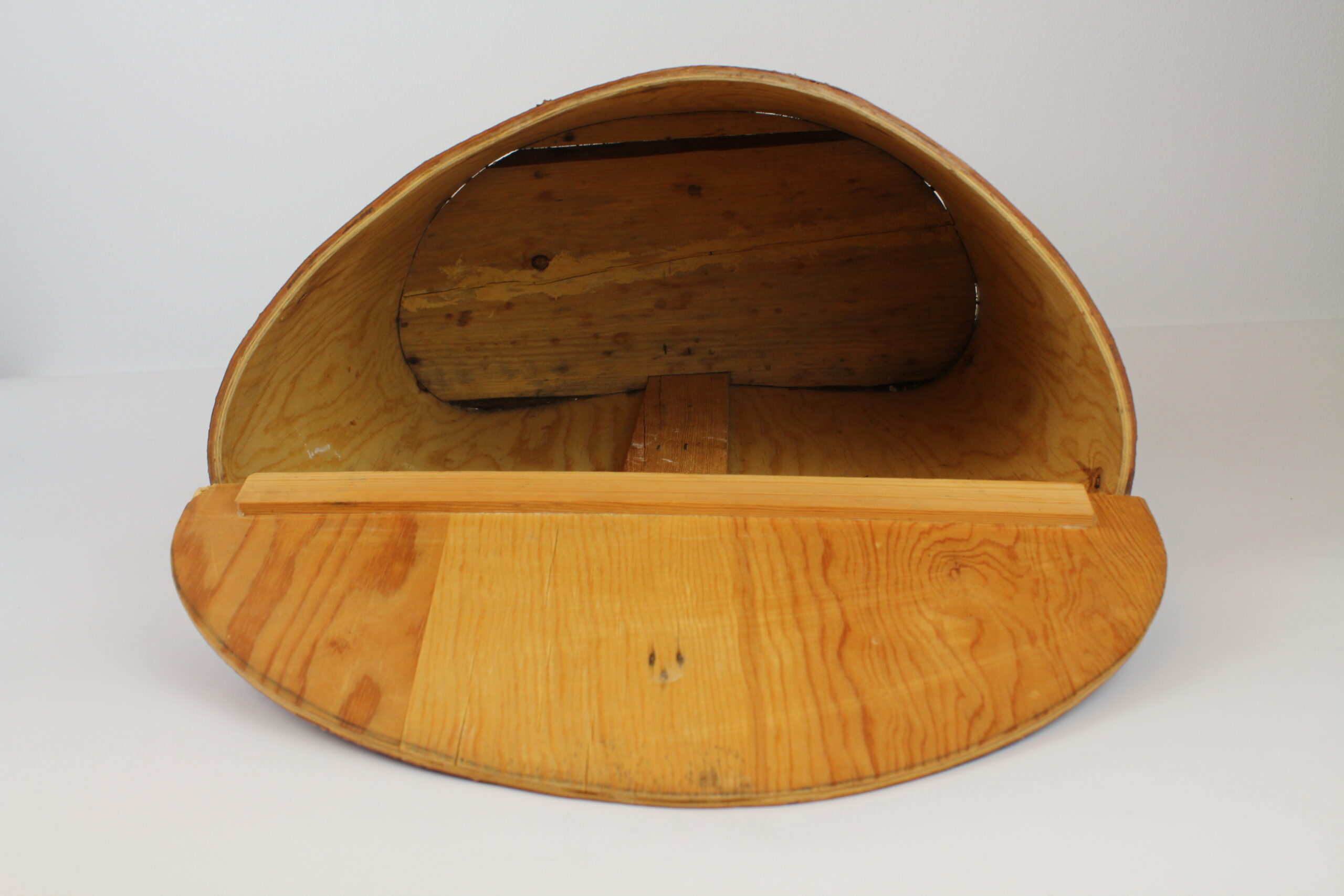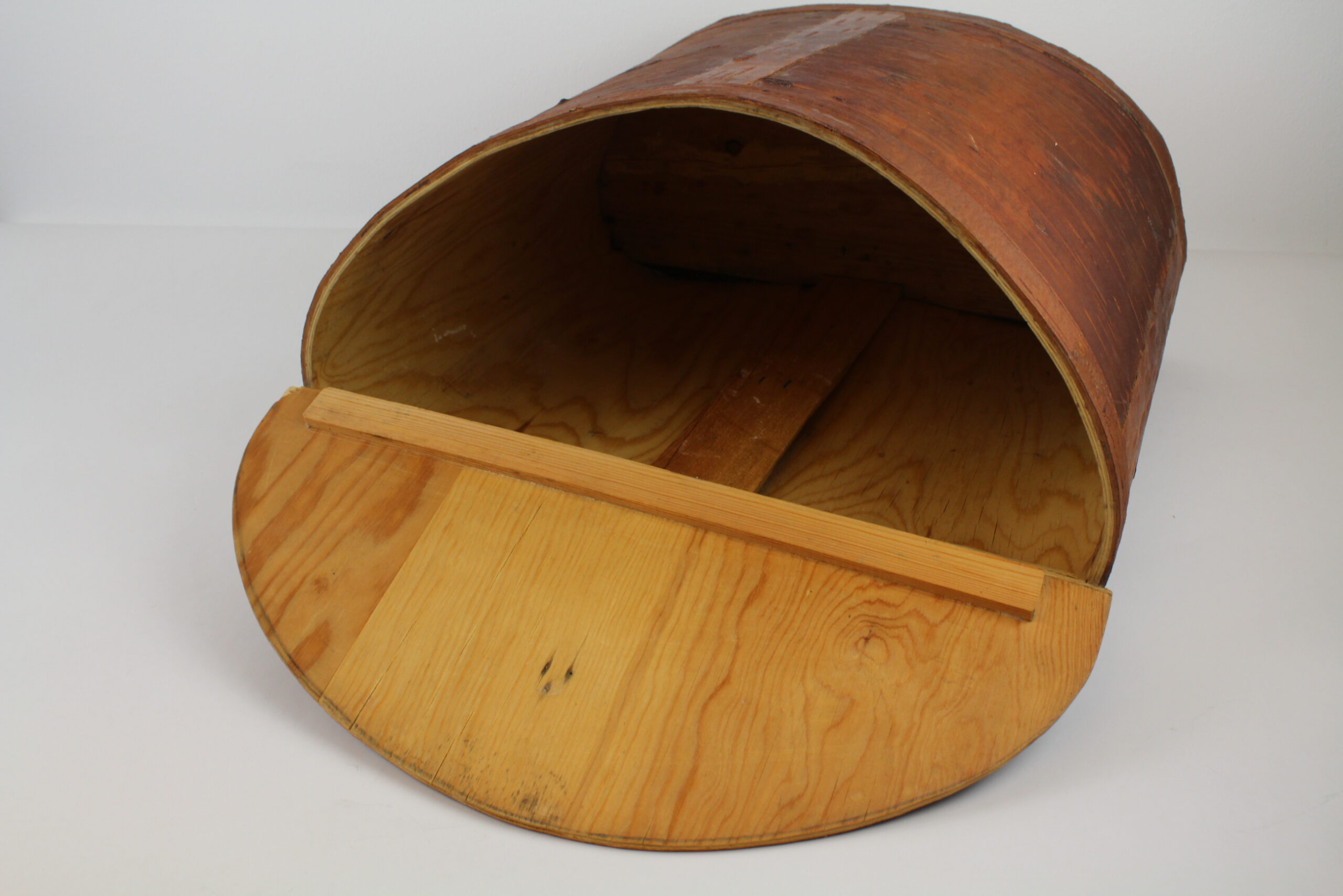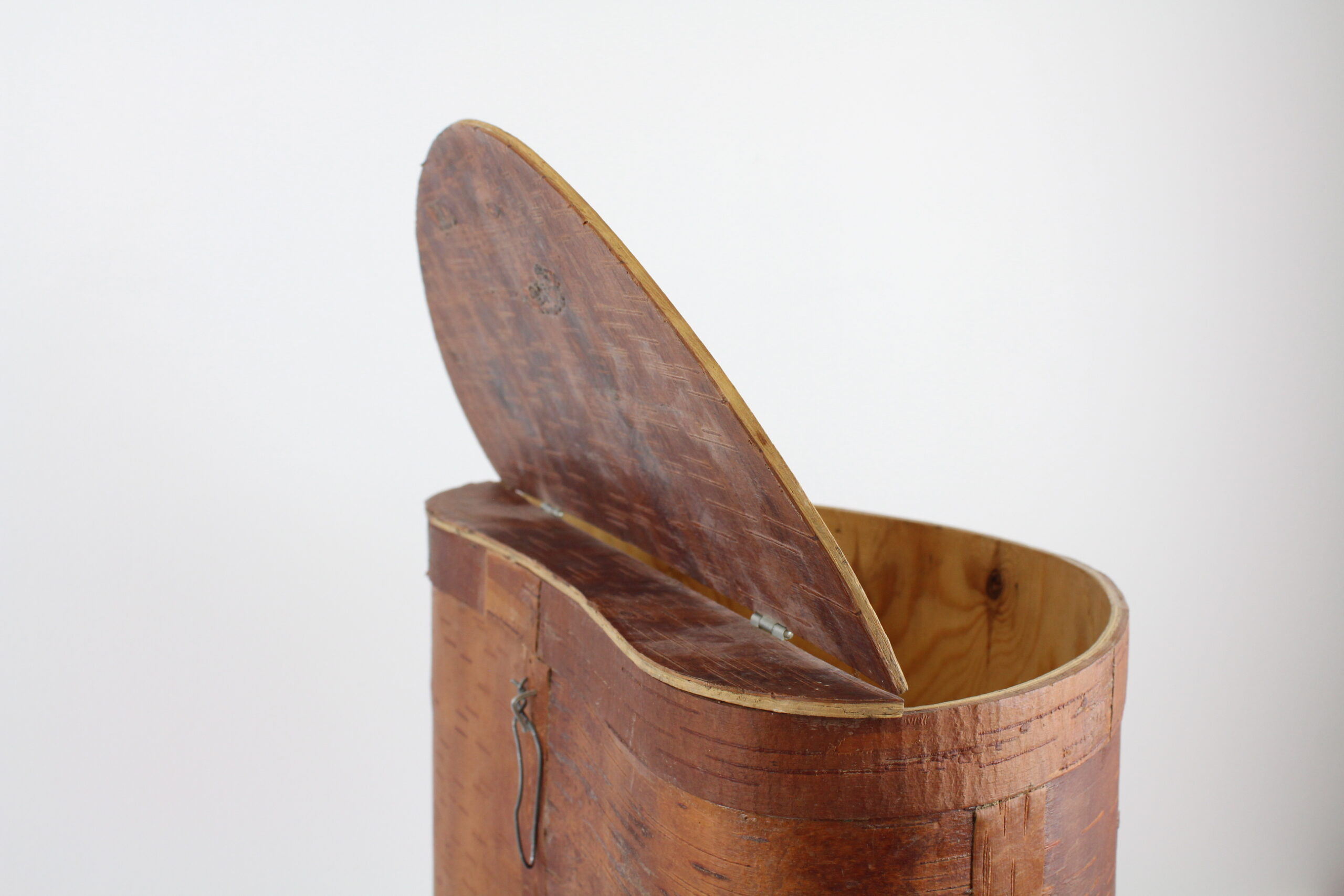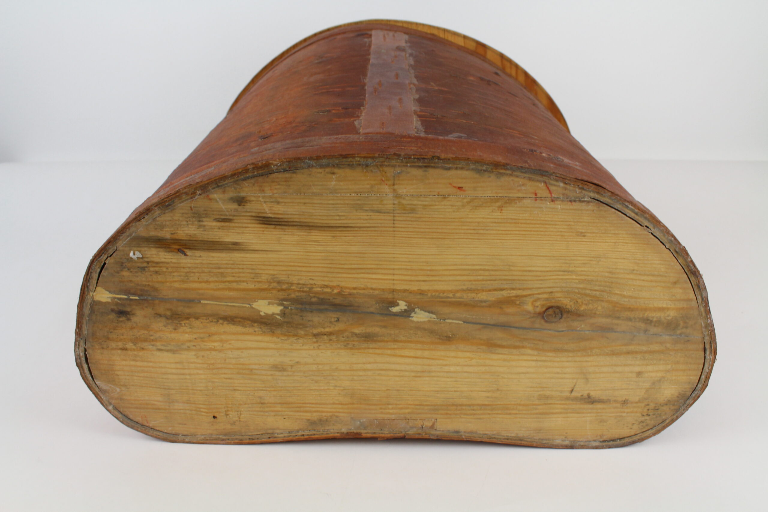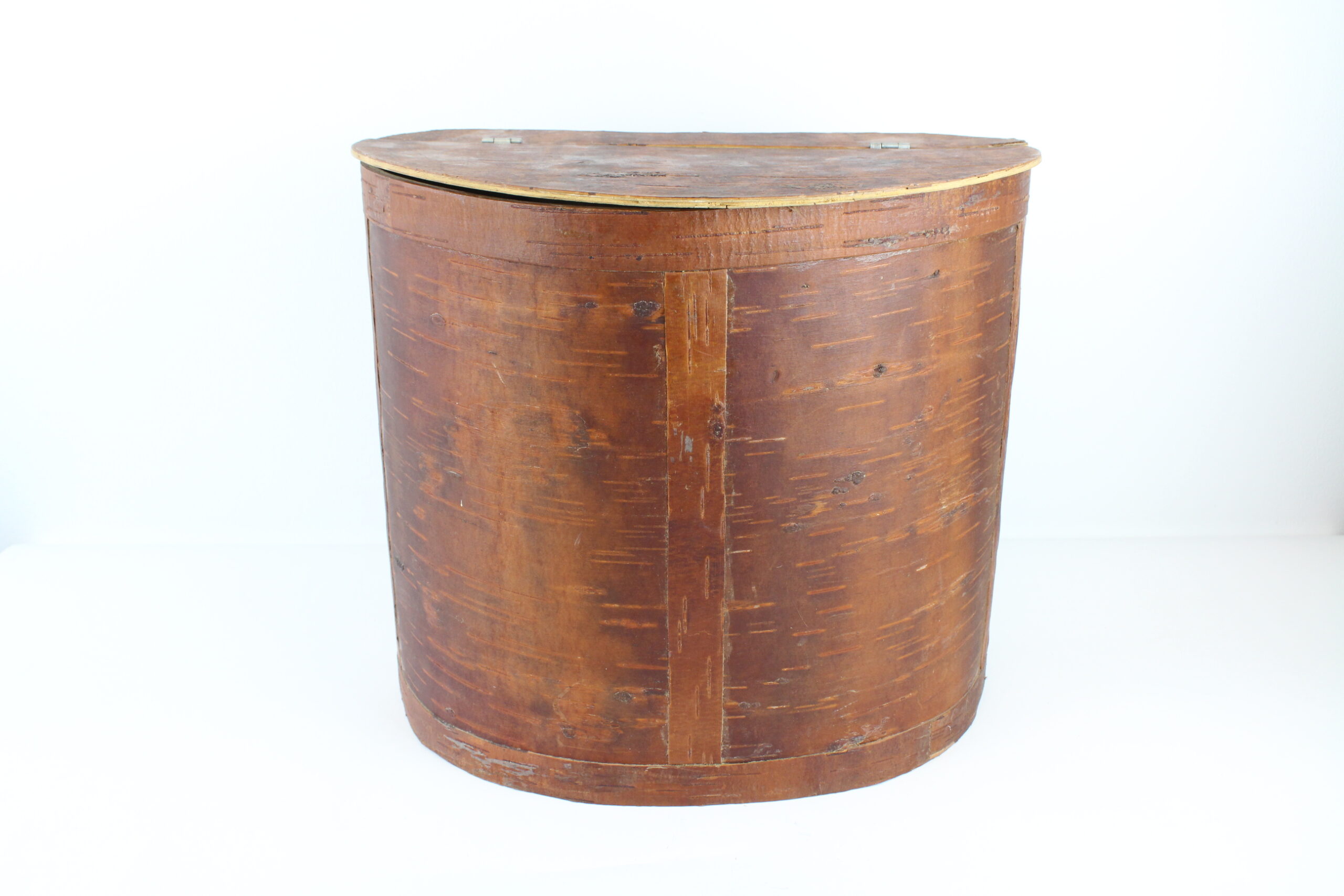 Stor, handgjord brun tunna med lock. Användes som ryggsäck förr i tiden, remmarna följer ej med. Vackert hantverk!