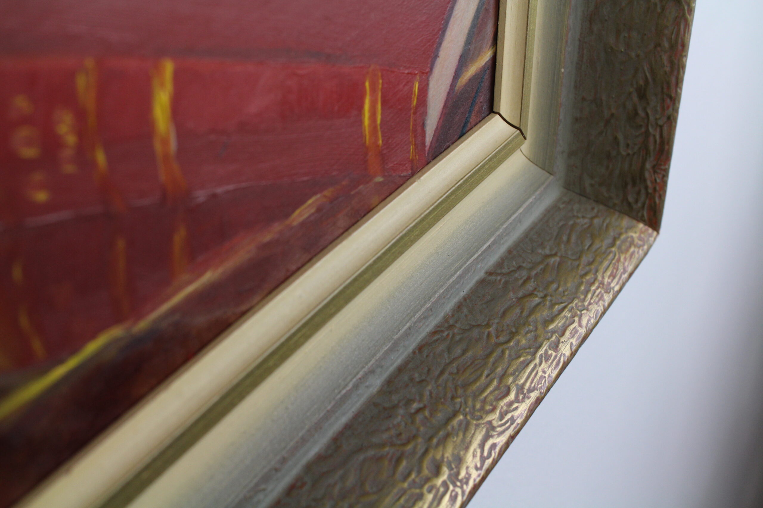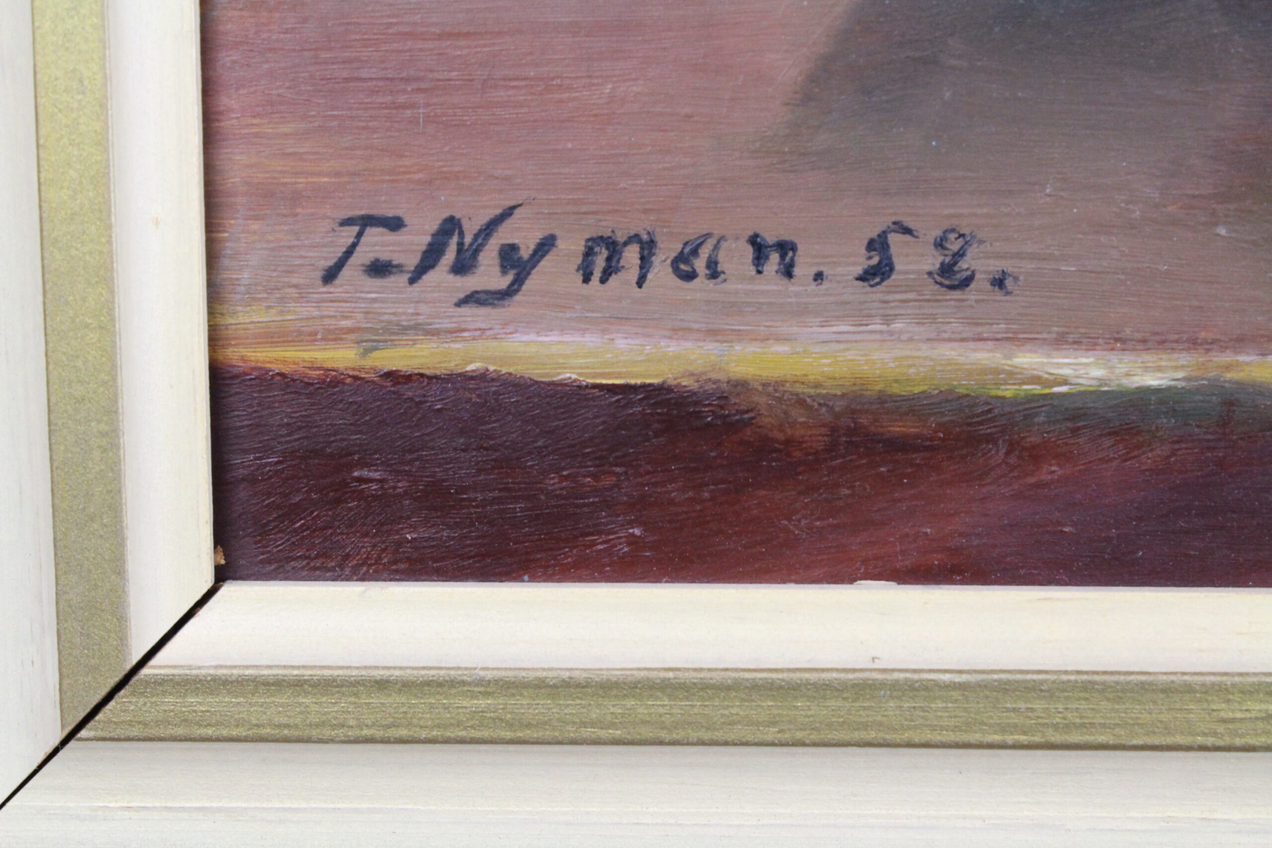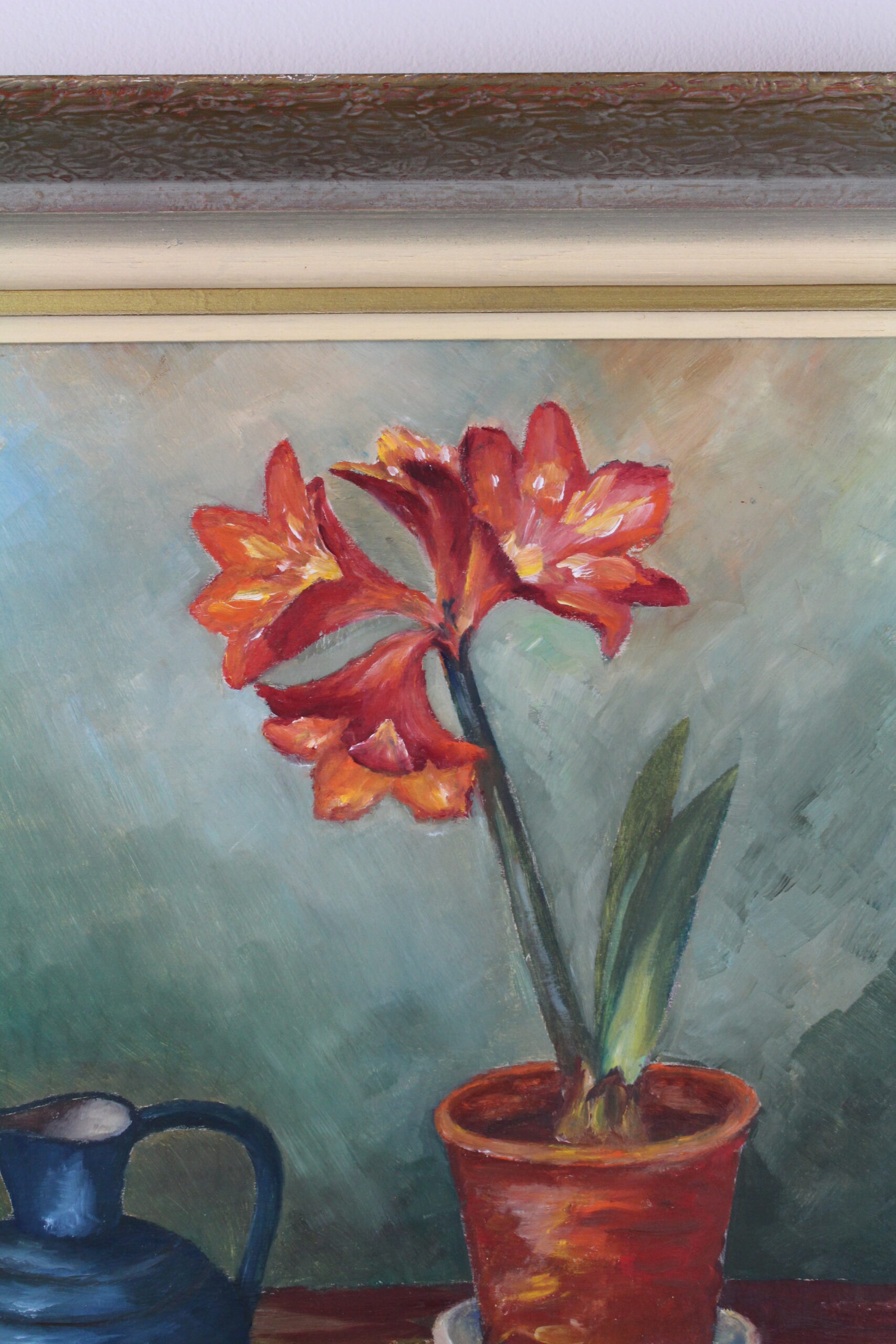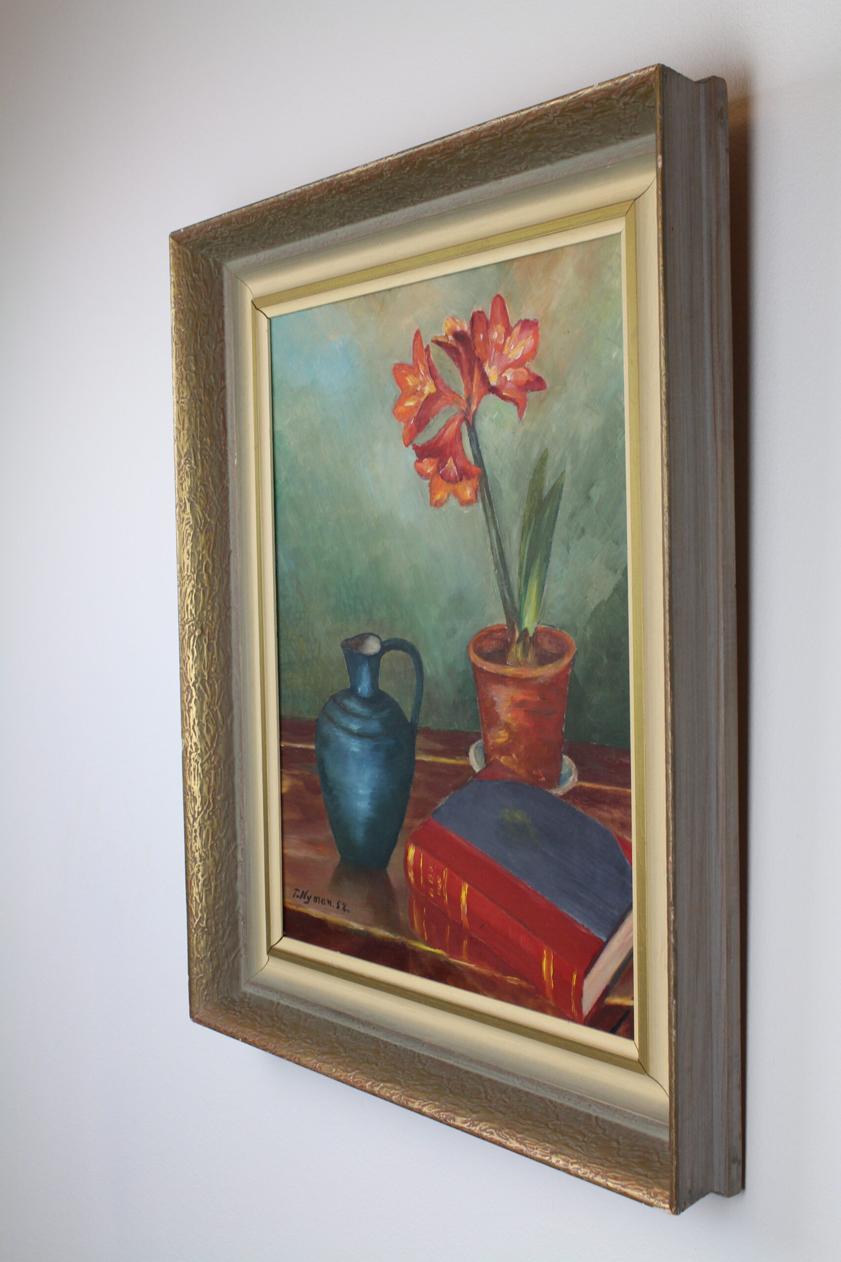 Handmålad tavla med blommande Clivia och böcker. Signerad T-Nyman.